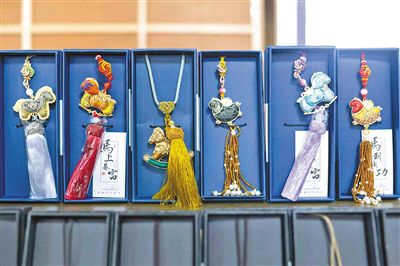 在這裡,殘疾人學員張小霞正細心制作宋錦挂件。2024年9月來到中心后,她先后學習了宋錦、剪紙、掐絲琺琅等多項非遺技藝。“這裡不僅提供了就業崗位,更讓我感受到了溫暖和信心。”張小霞說。