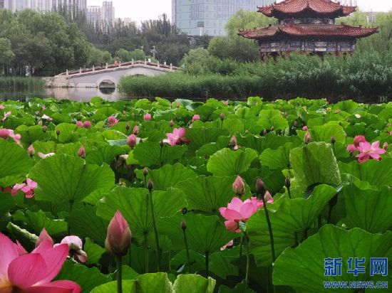 呼和浩特青城公园内的楼亭、拱桥、荷花相映成景。新华网 徐梅摄
