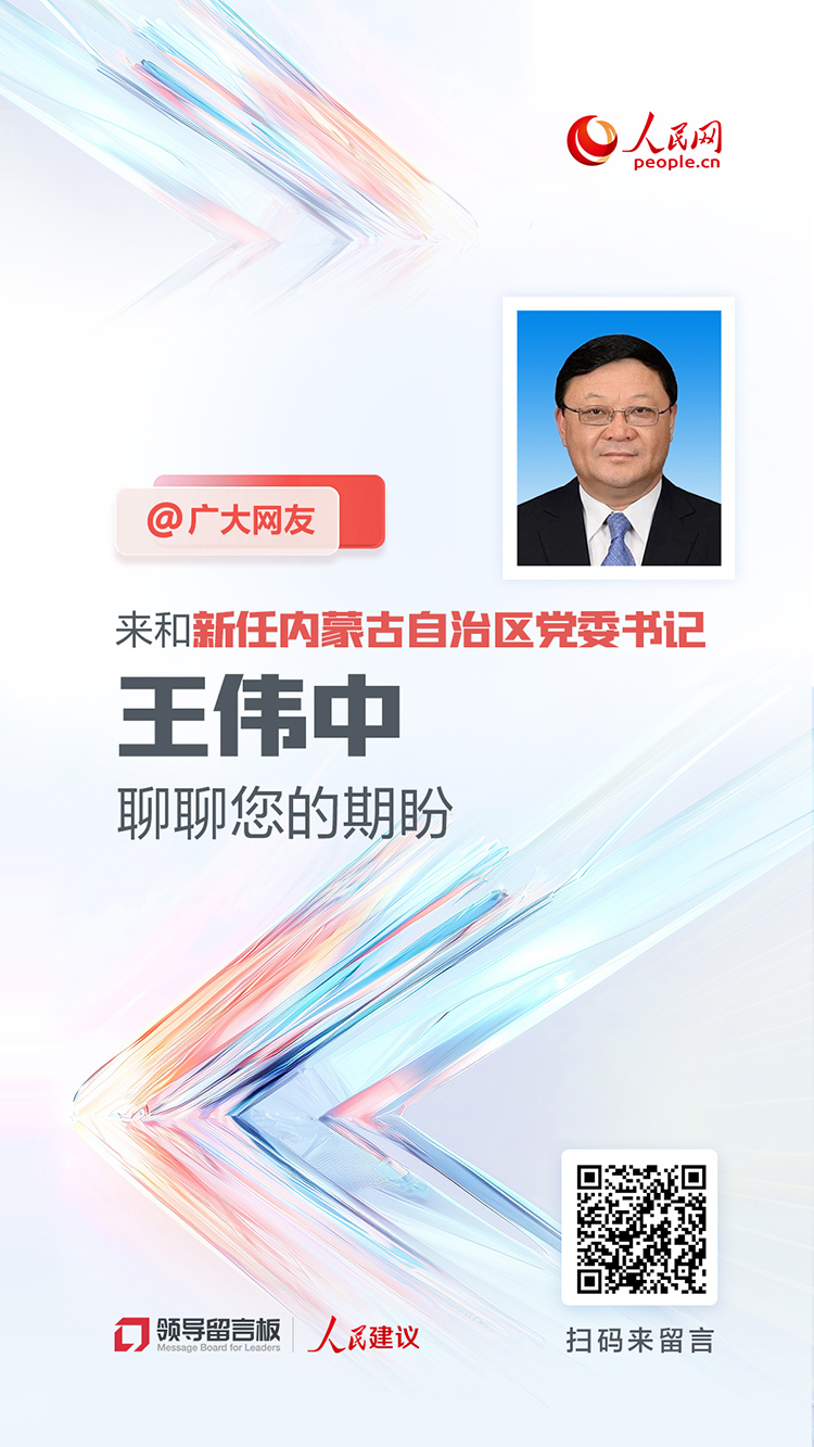近日,人民网“领导留言板”邀请广大网友,来和新任内蒙古自治区党委书记王伟中聊聊对内蒙古发展的新期盼。征集活动开展以来,网友踊跃参与,提出了不少金点子、好建议。