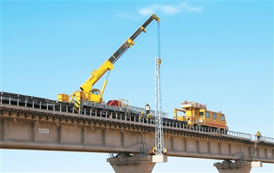 太锡铁路南起河北省张家口市崇礼铁路太子城站,途经张家口市、内蒙古自治区锡林郭勒盟,北至锡林浩特站。铁路全线通车后,将与崇礼铁路、京张高铁共同构成锡林郭勒盟、张家口北部地区进京快速客运通道。图为中铁电气化局建设者在太锡铁路闪电河特大桥,有序开展接触网钢柱安装作业。